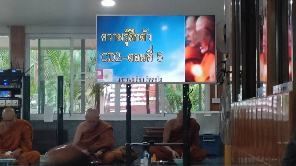 สายตาดันไปสะดุดกับภาพบนทีวีของวัด—กำลังเปิด **เสียงหลวงพ่อเทียน** จากไฟล์ *CD ความรู้สึกตัว 2* ที่ถูกแปลงมาจาก MP4 ใน YouTube